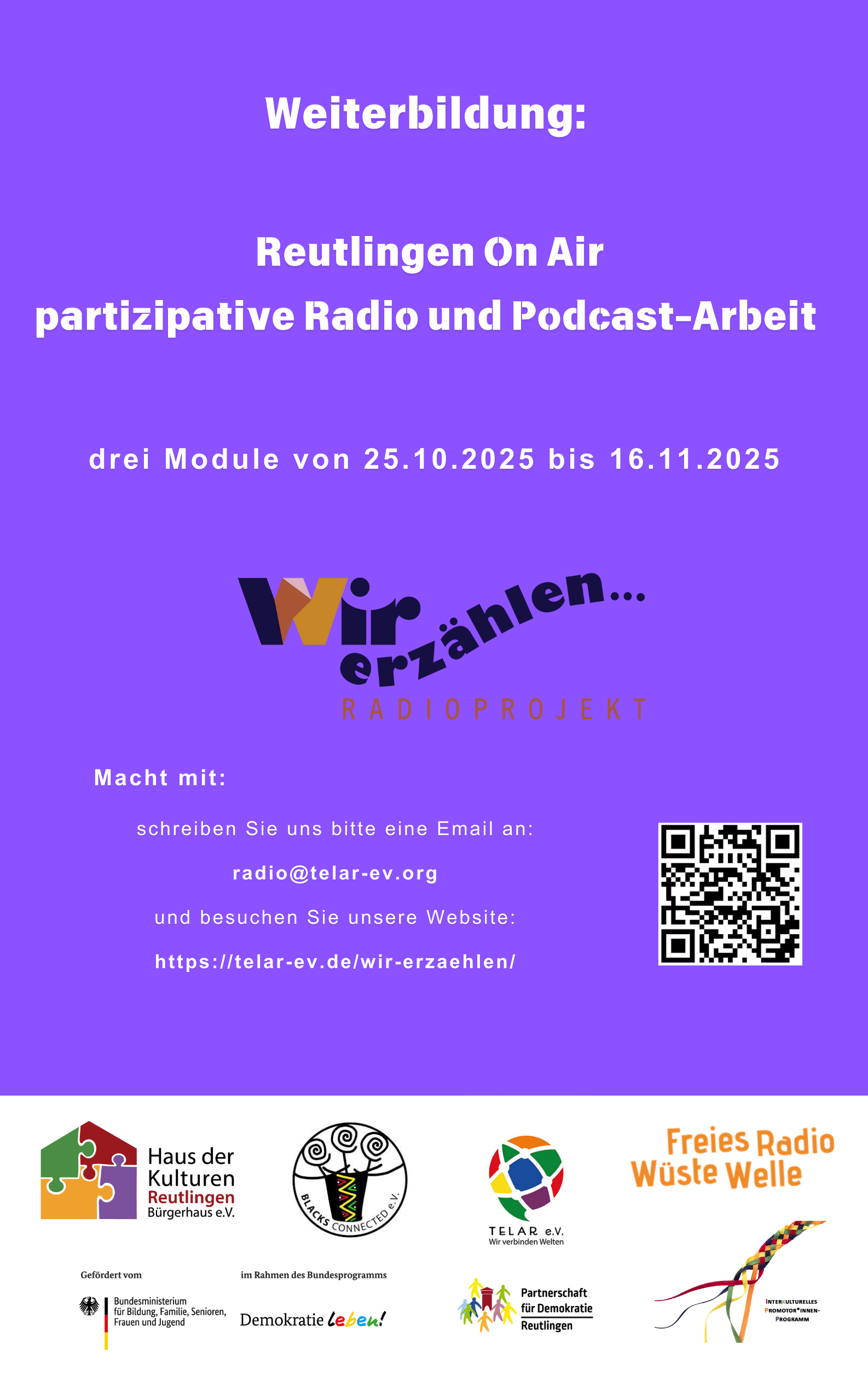 In Kooperation mit Wüste Welle, Blacks Connected e.V., Haus der Kulturen Reutlingen e.V., IKPP und Telar e.V., Unterstützt und finanziert von der Partnerschaft für Demokratie Reutlingen im Rahmen des Bundesprogramms Demokratie Leben!.